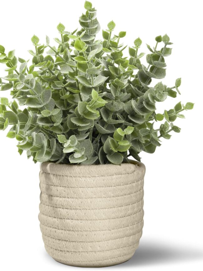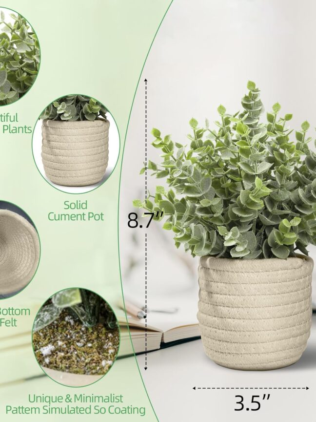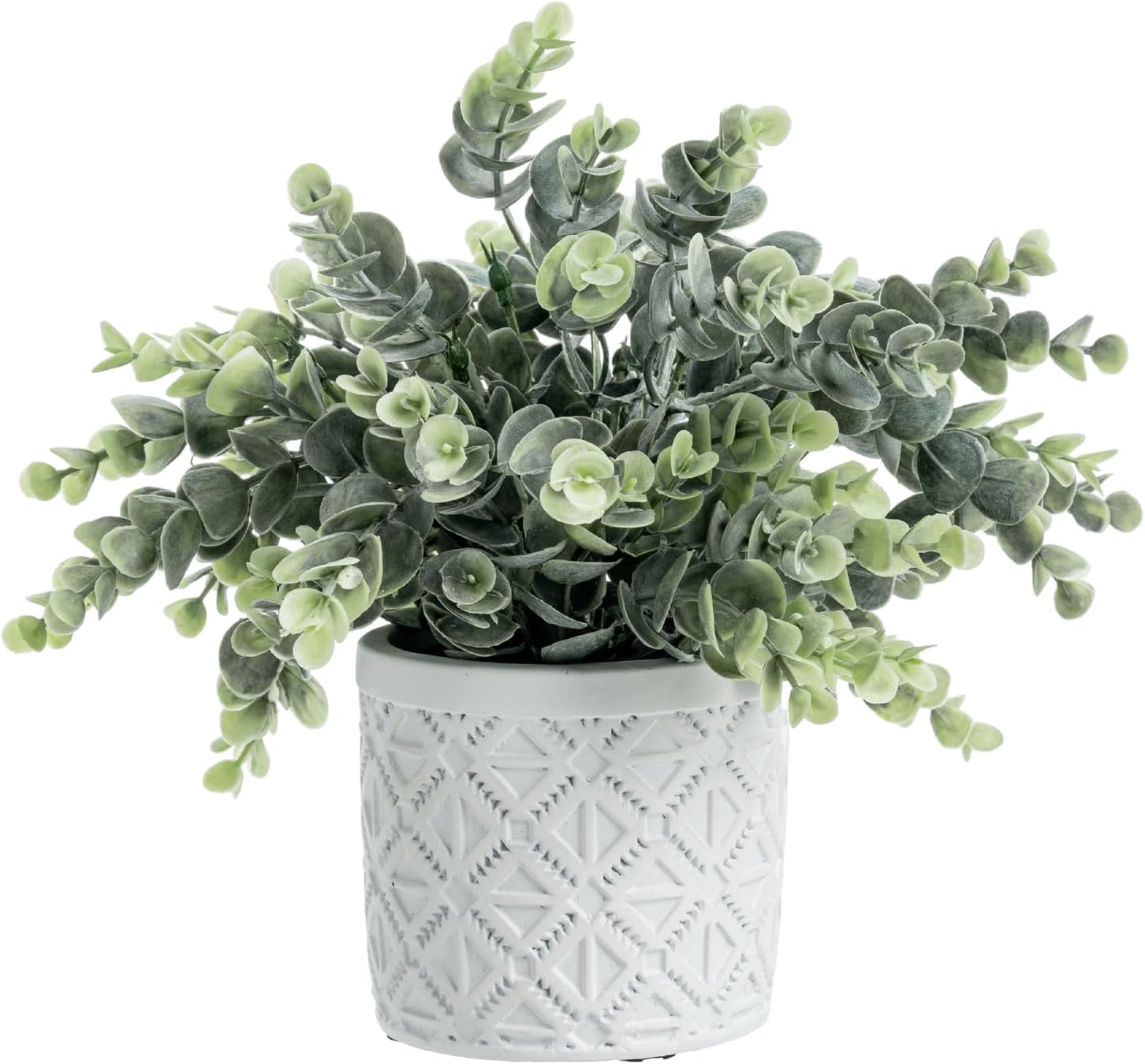 - Desktop artificial eucalyptus greenery potted plant with modern geometric embossed pattern concrete pot planter for your home, office or event settings
