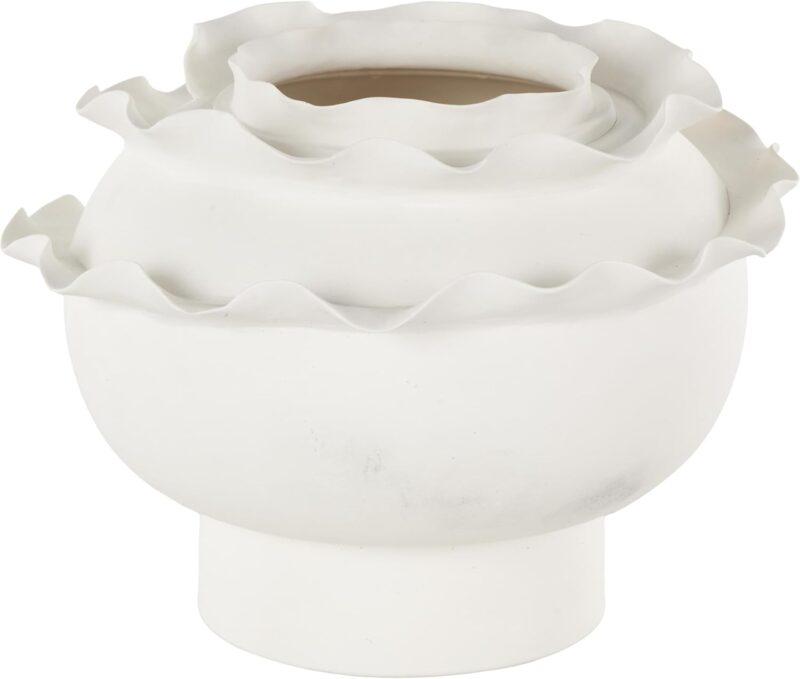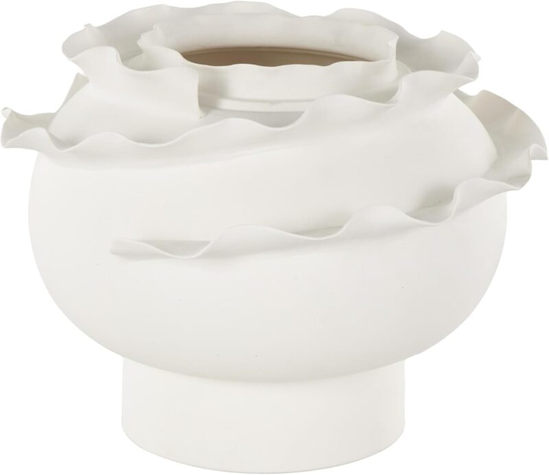 Ceramic Abstract Wide Rounded Floral Vase with Layered Petals, 12″ x 12″ x 9″, White