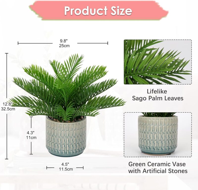 - 🪴 Premium Material – Artificial palm leaves are made of high quality soft plastic, real touch, will not wilt and fade, safe and non-toxic. The leaves contain iron wire inside, so you can adjust the shape of the artificial greenery at will. The ceramic planter pot mouth is covered with a layer of real stones to make this artificial plant in pot more vibrant.